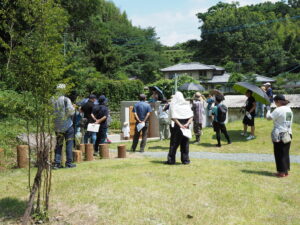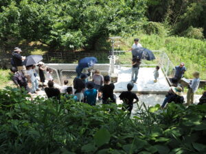 集合場所のこども戸豊水ガーデンから歩きながら、発電所が出来た経緯や、水車やヘッドタンクの説明、小水力発電の仕組みについてを説明を行いました。水分神の碑の前では参加者との質疑応答の時間もあり、なぜ「こども」水力発電所と名付けたのかの理由もお話ししました。