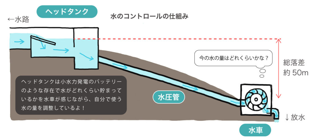 ヘッドタンクは、水路から水と一緒に流れてくる砂や枝葉など取り除き、きれいな水を貯める役割があります。ここから水圧管で発電所へ水を送ります。